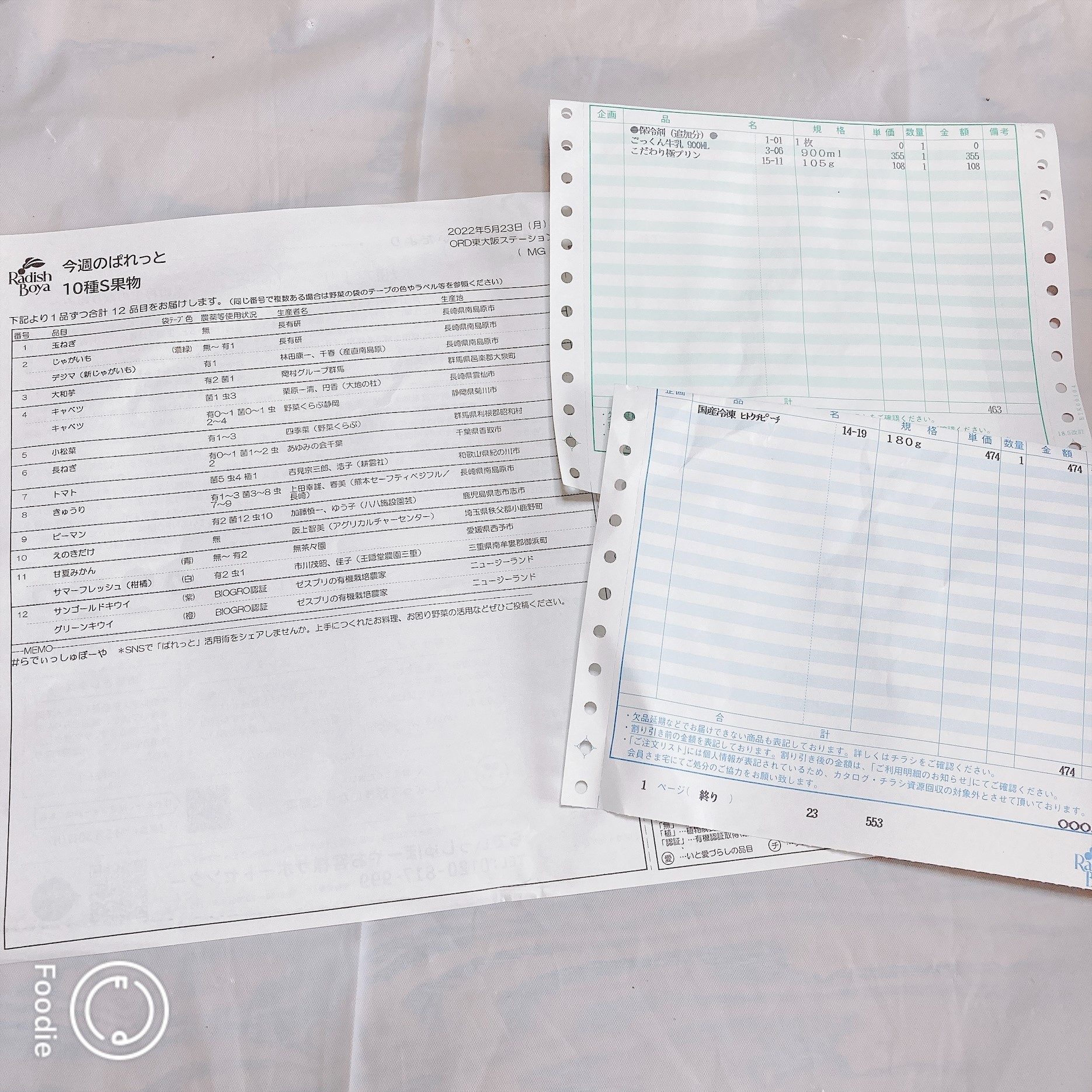 ぱれっとの納品書には有機の有無、農薬の使用頻度、産地などが